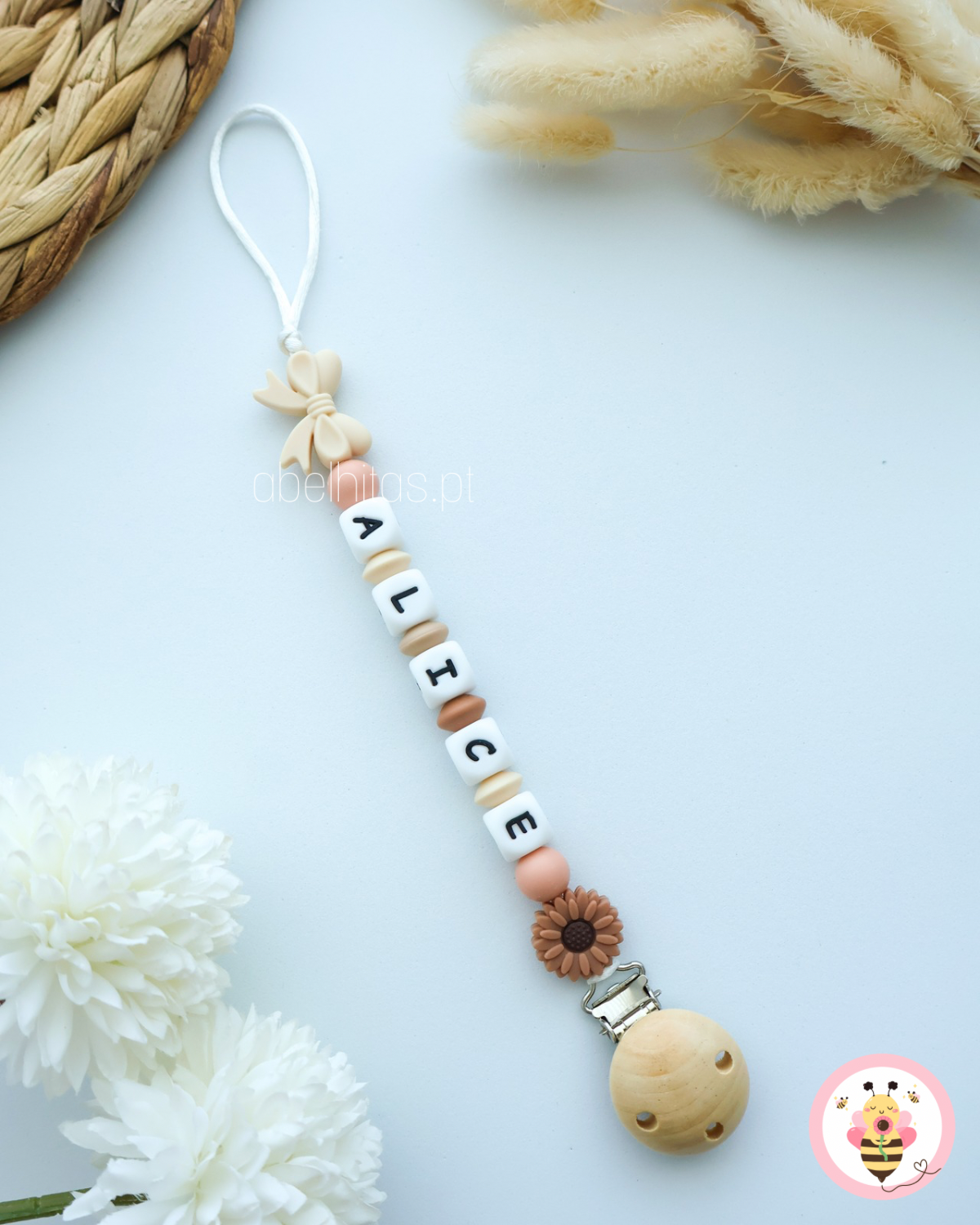 Prendedor de chupeta feito de silicone de grau alimentar. Mola de madeira envernizada.