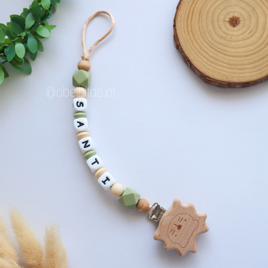 Prendedor de chupeta com nome - Leão madeira