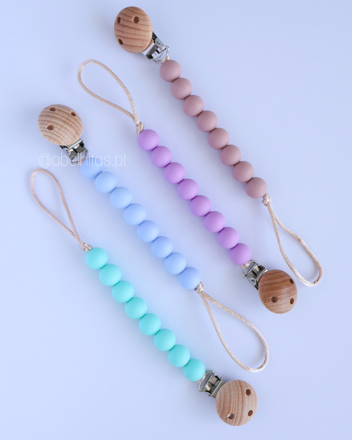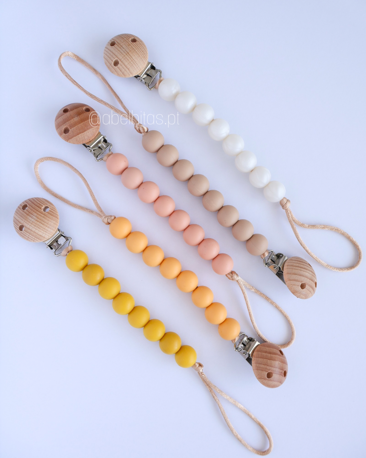 Attache-tétine en silicone alimentaire. Ressort en bois naturel traité.