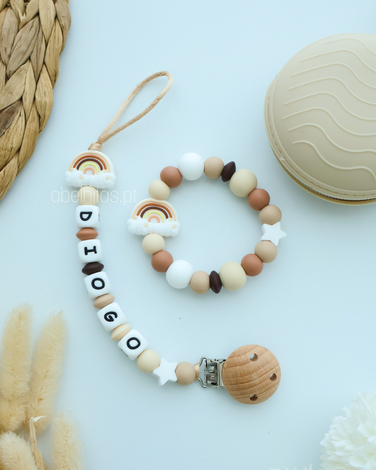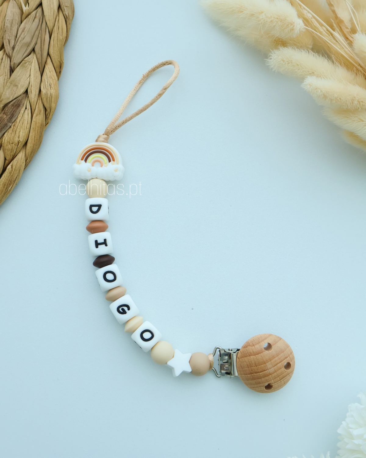 Prendedor de chupeta personalizado com o nome do bebé para torná-lo uma peça única e original.