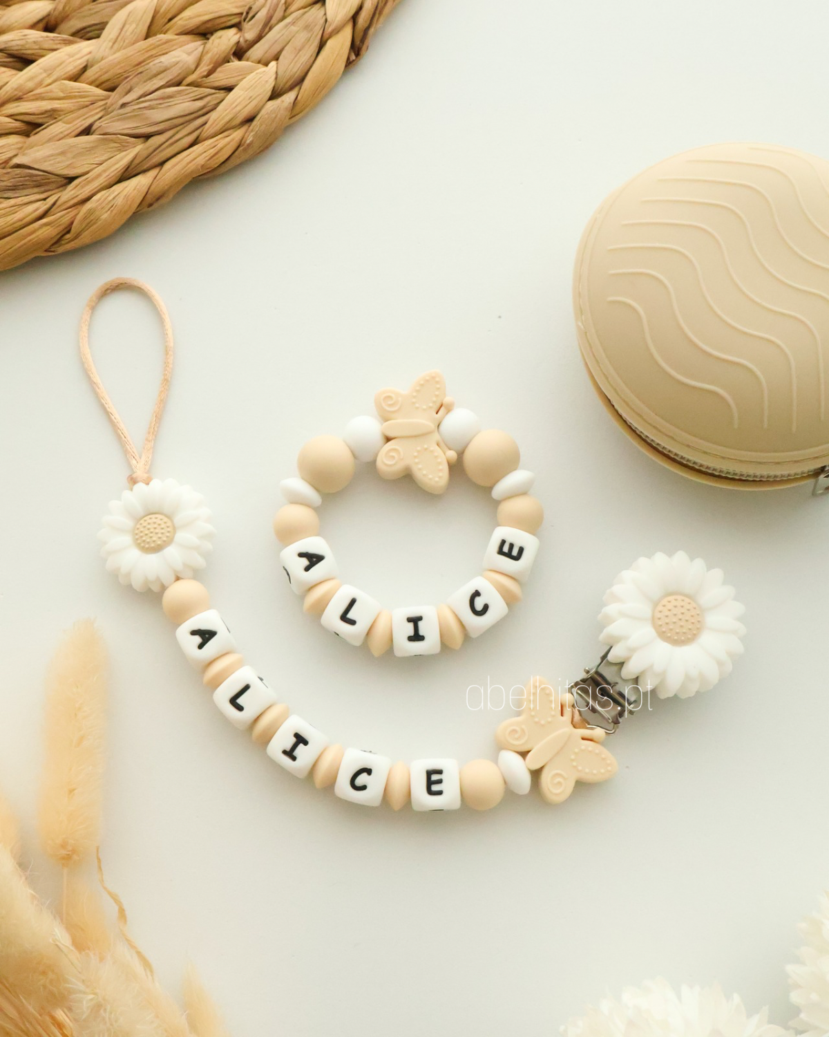 Prendedor de chupeta personalizado com o nome do bebé para torná-lo uma peça única e original.