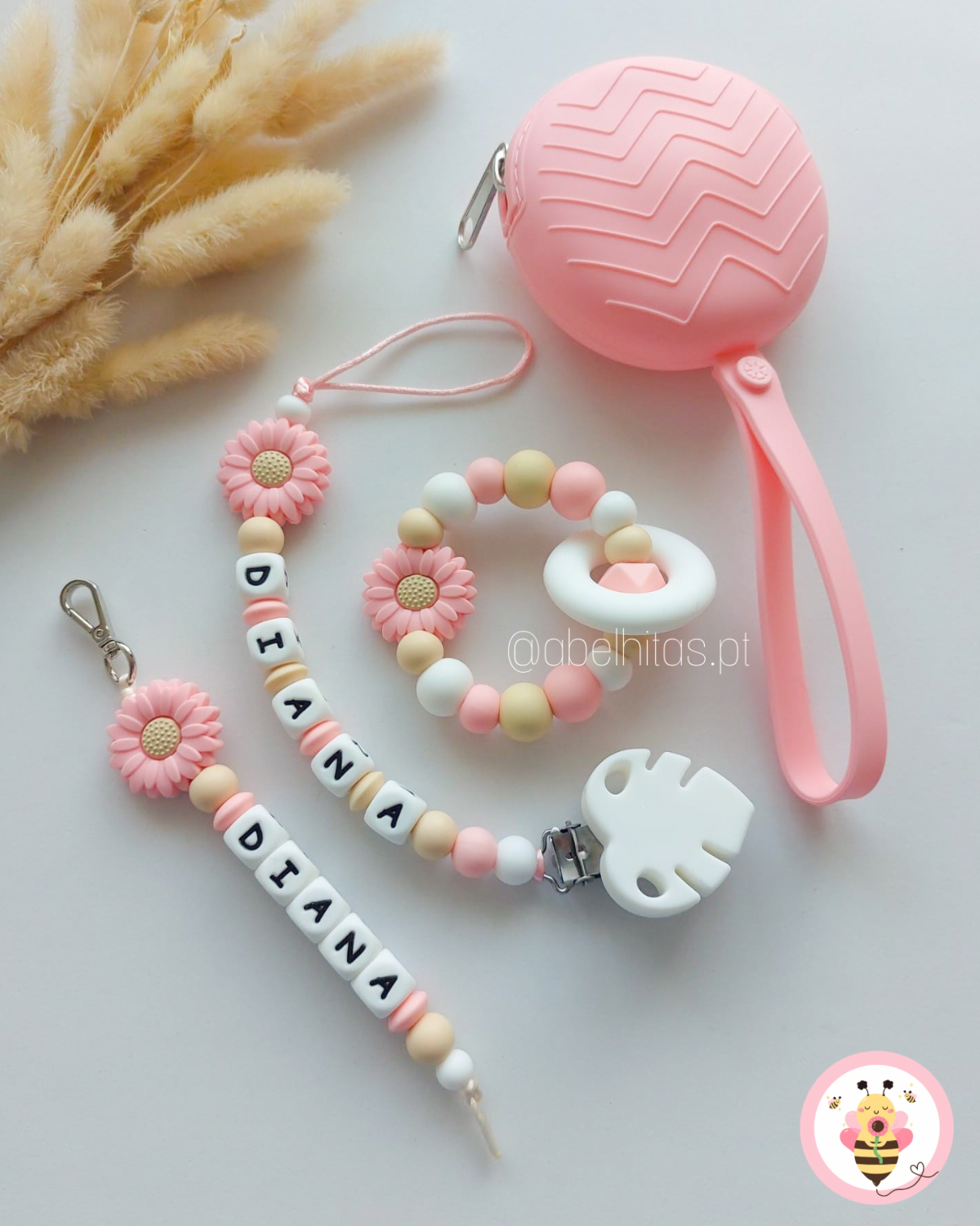 Prendedor de chupeta personalizado com o nome do bebé para torná-lo uma peça única e original.
