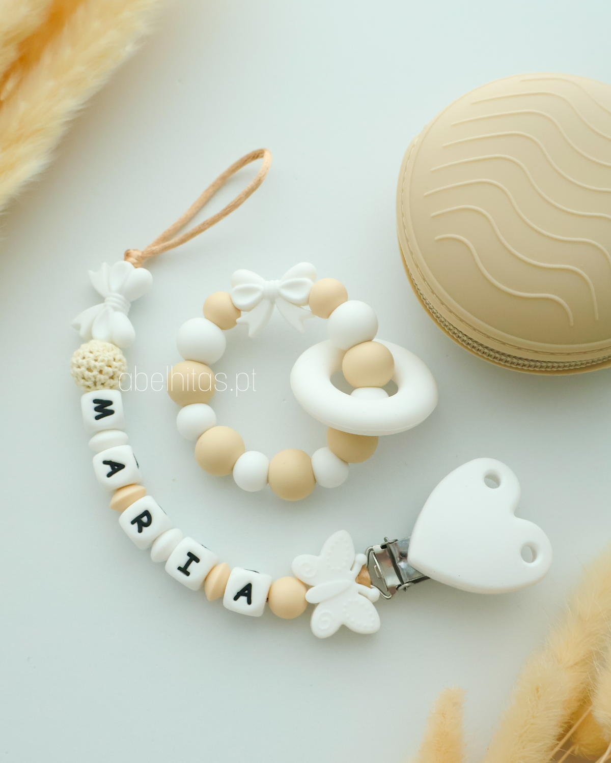 1 prendedor de chupeta + 1 mordedor + 1 bolsa porta-chupetas