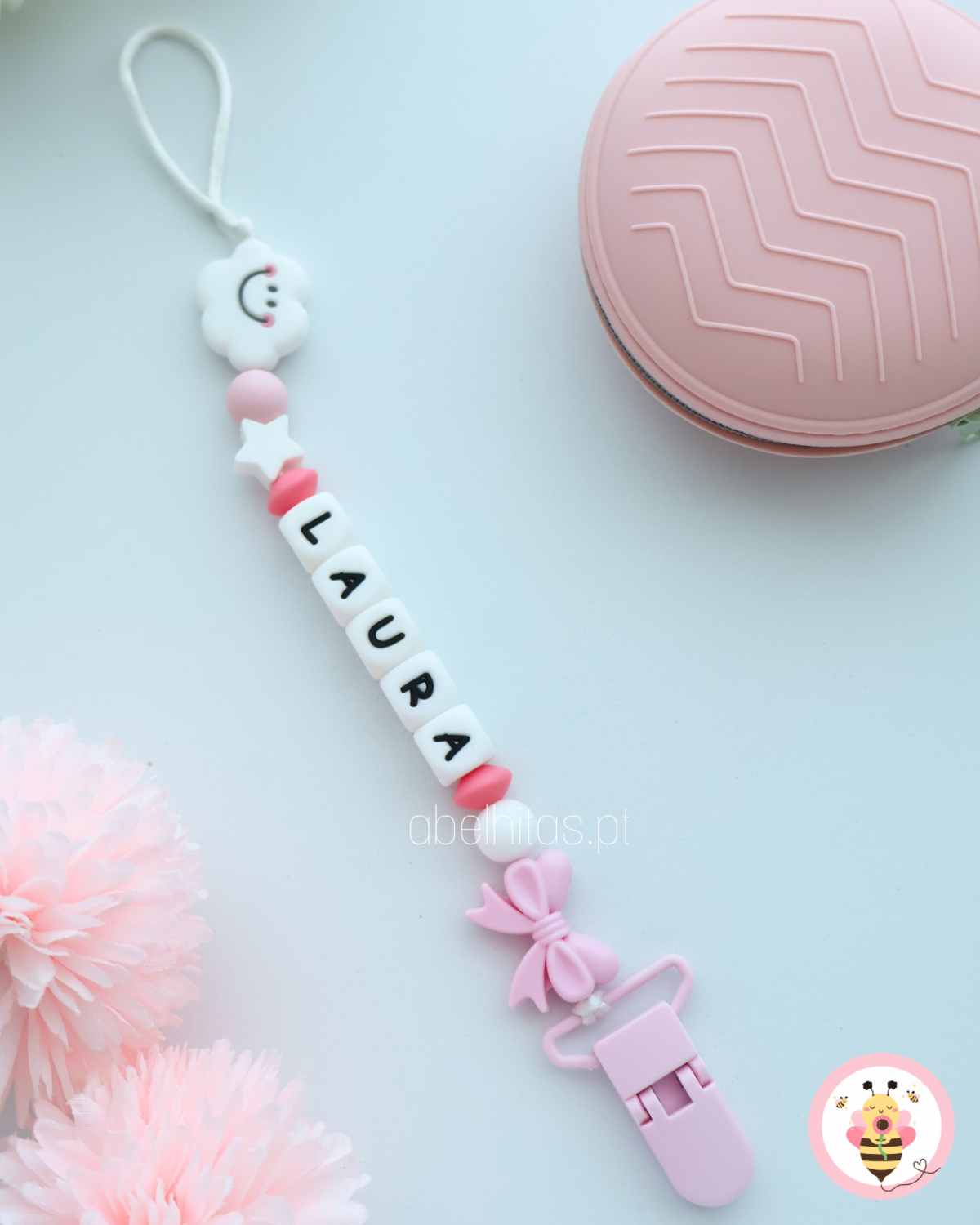 Prendedor de chupeta personalizado com o nome do bebé para torná-lo uma peça única e original.