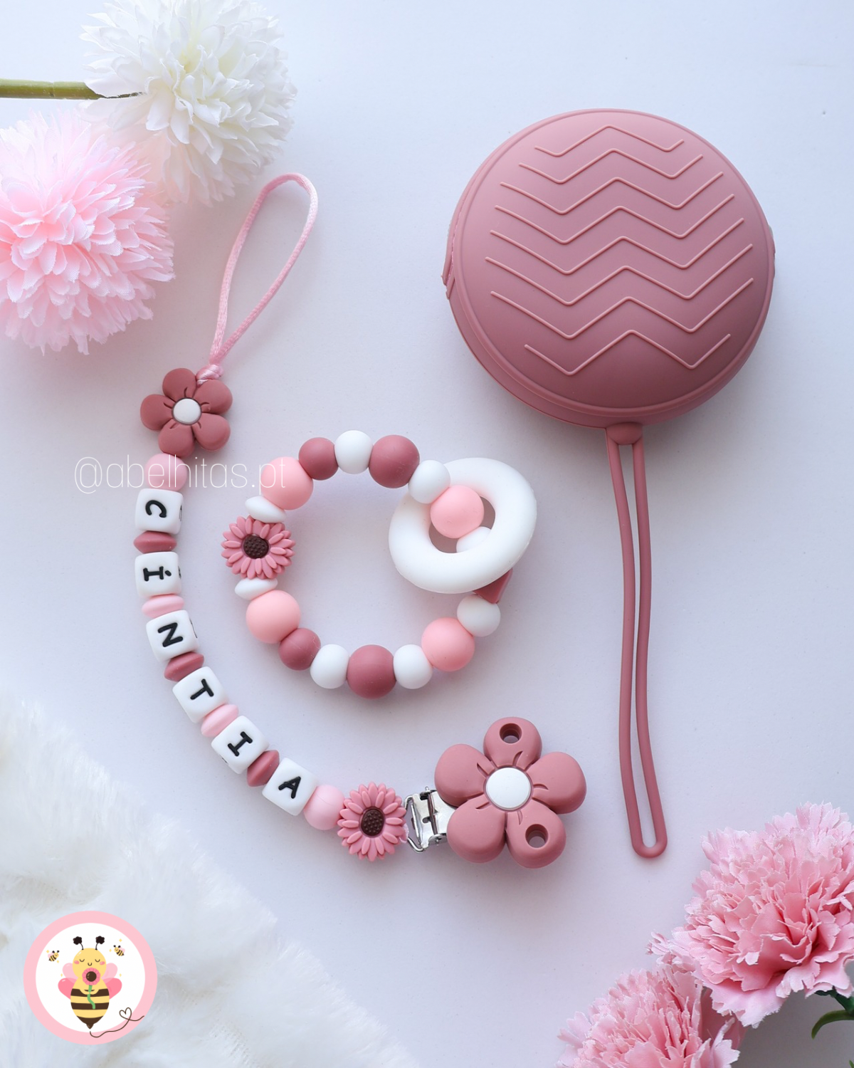 1 prendedor de chupeta + 1 mordedor + 1 bolsa porta-chupetas