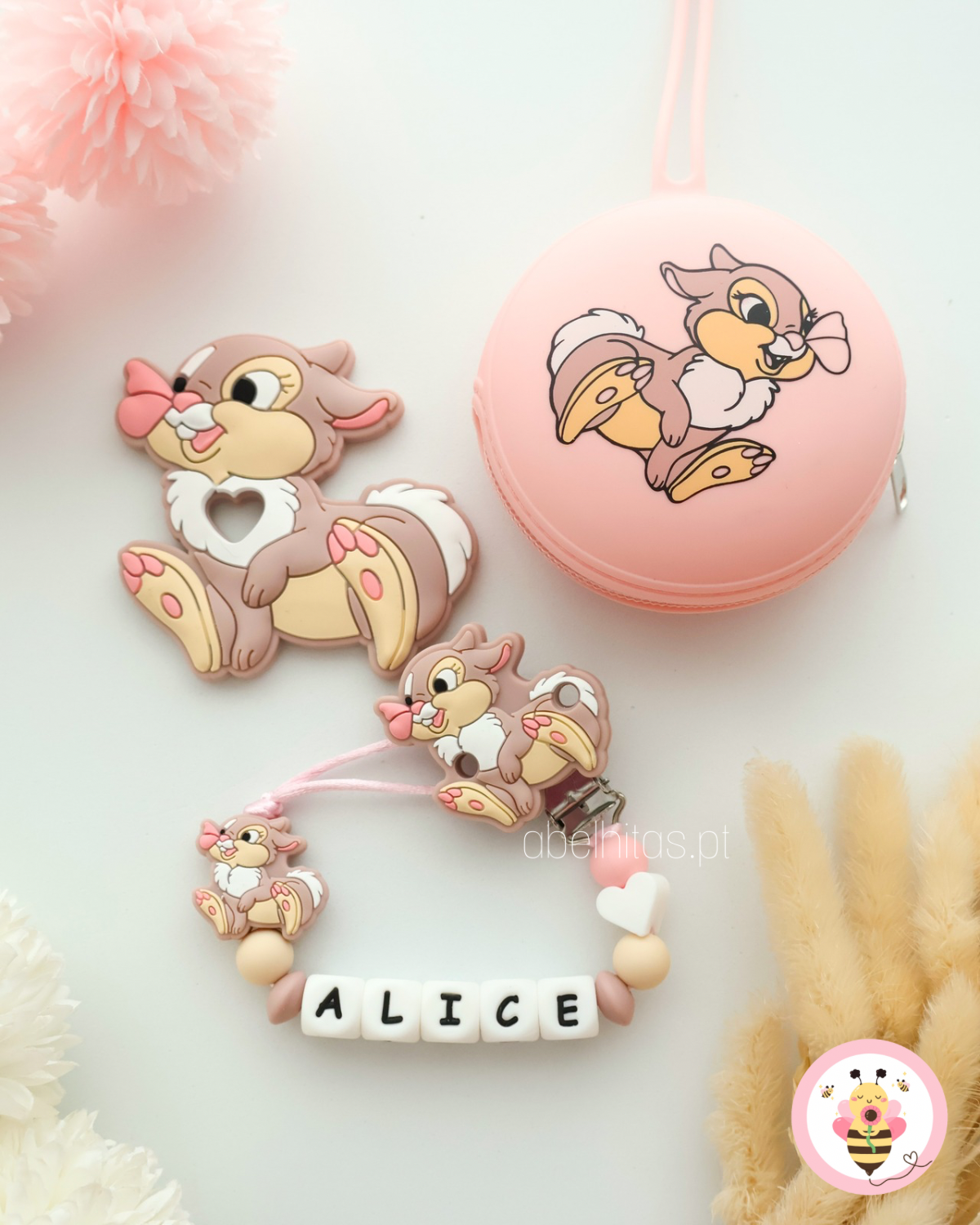 Prendedor de chupeta personalizado com o nome do bebé para torná-lo uma peça única e original.