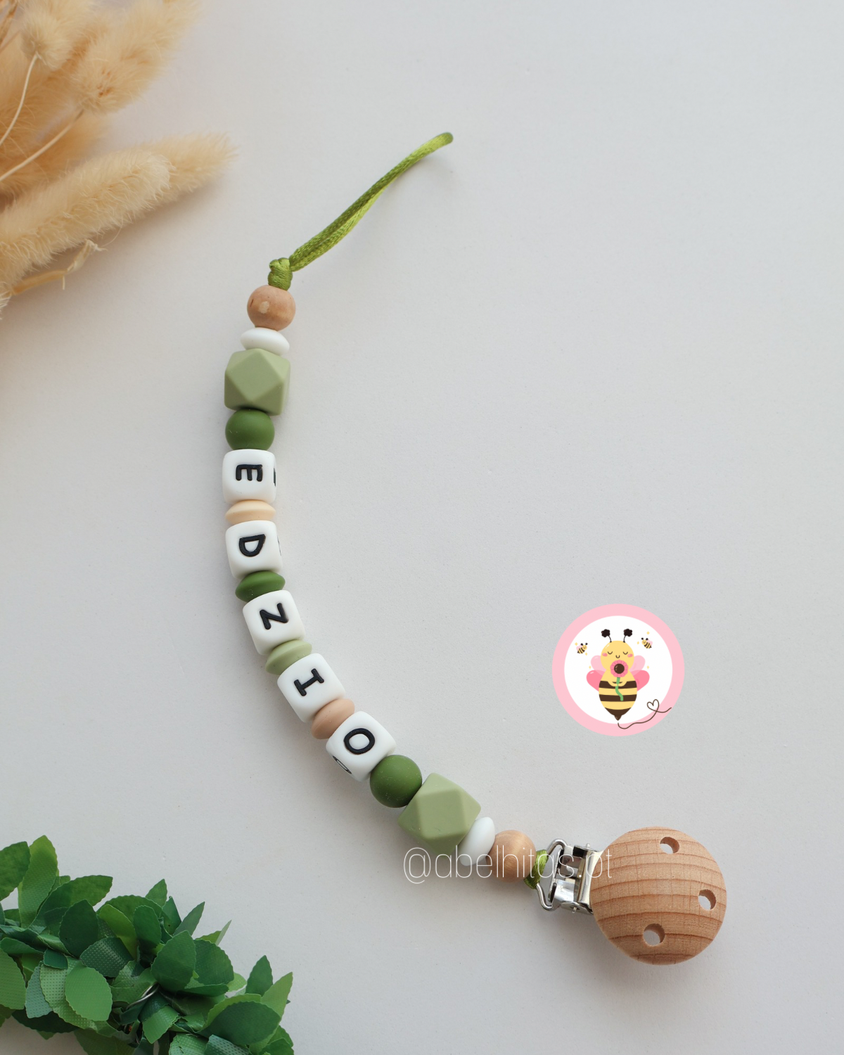 Prendedor de chupeta feito de silicone de grau alimentar e madeira . Mola em madeira natural tratada.