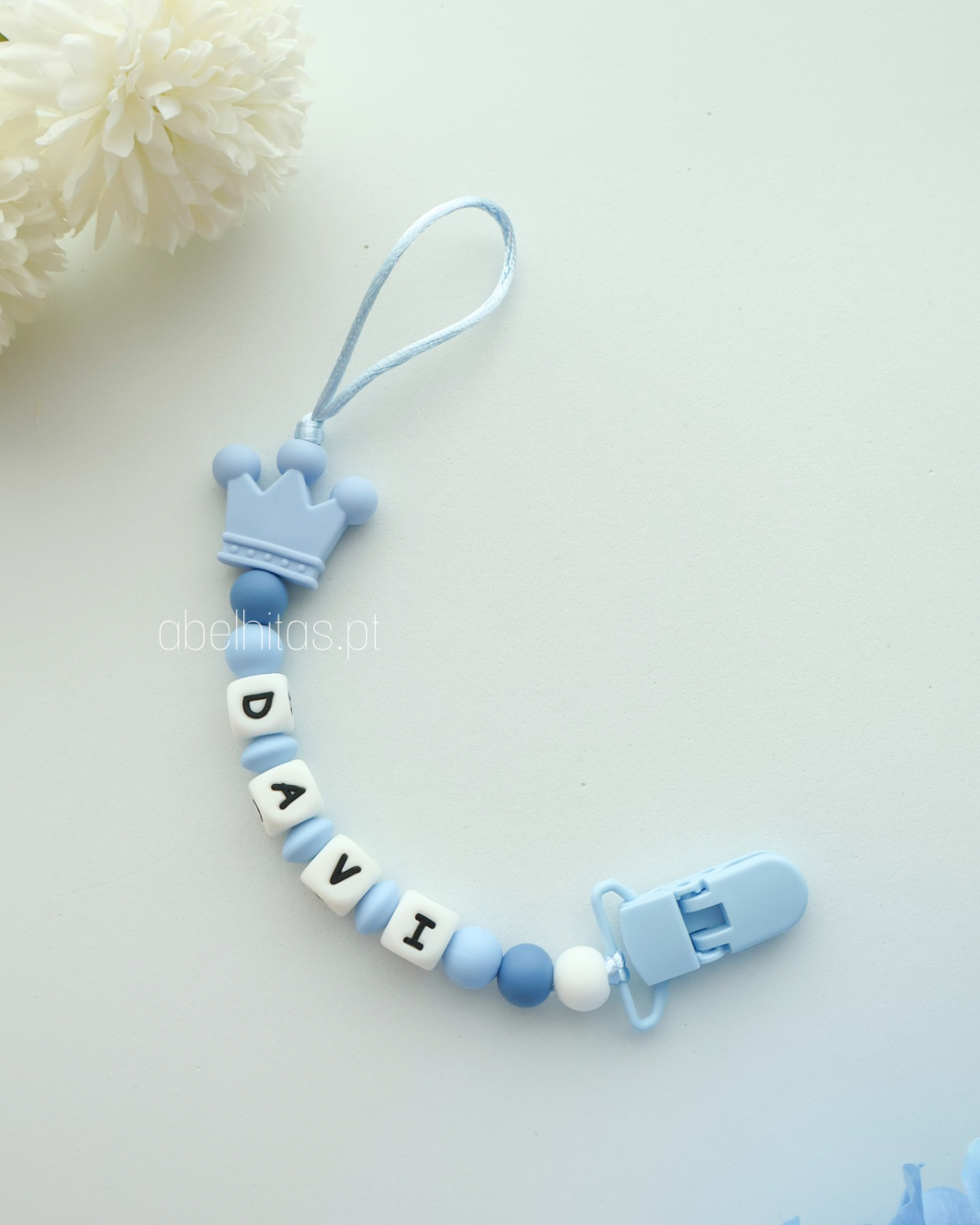 Prendedor de chupeta com nome - Coroa azul