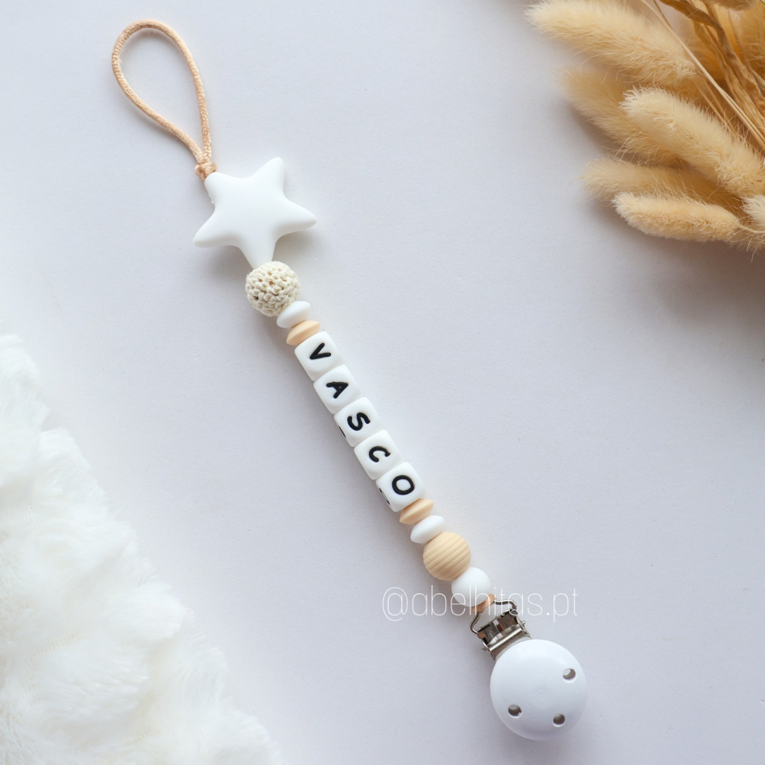 Prendedor de chupeta feito de silicone de grau alimentar, madeira e crochet. Mola de madeira envernizada.