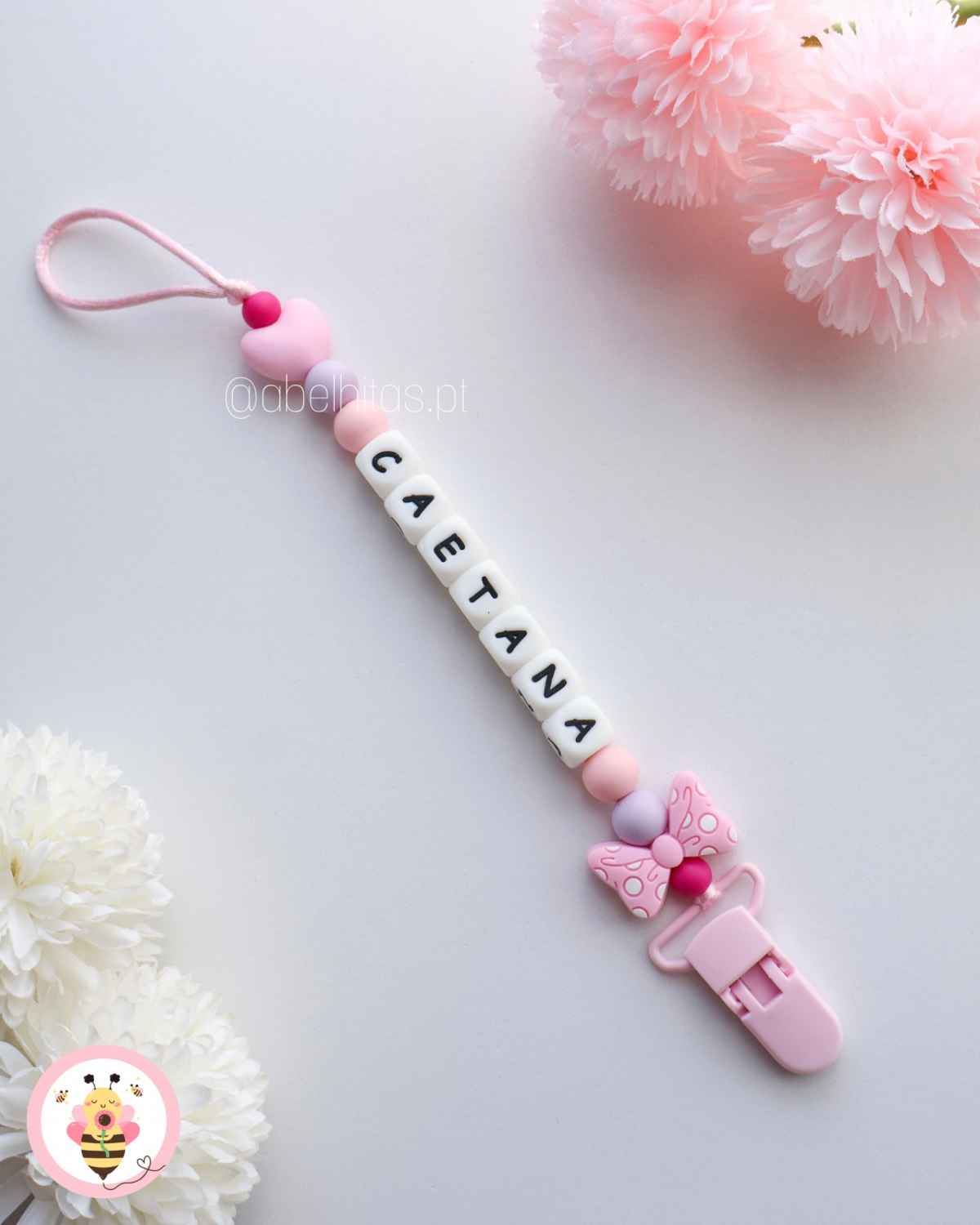 Prendedor de chupeta com nome - Laço bolinhas