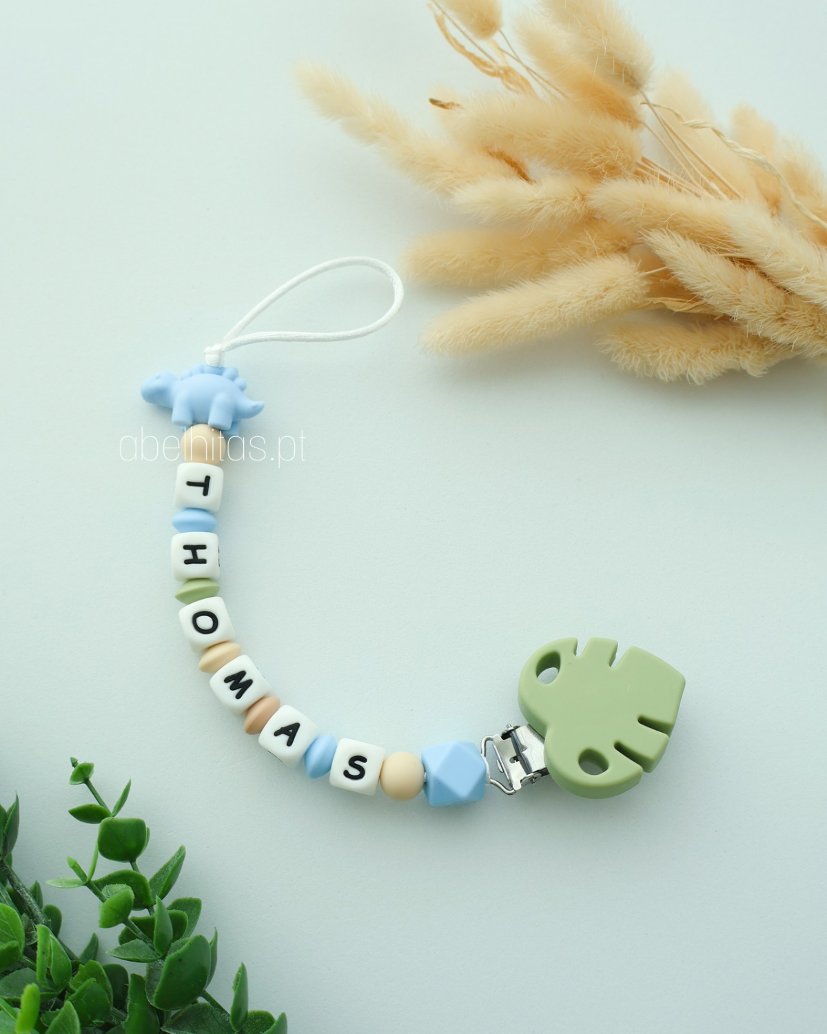 Prendedor de chupeta com nome - Dinossauro azul
