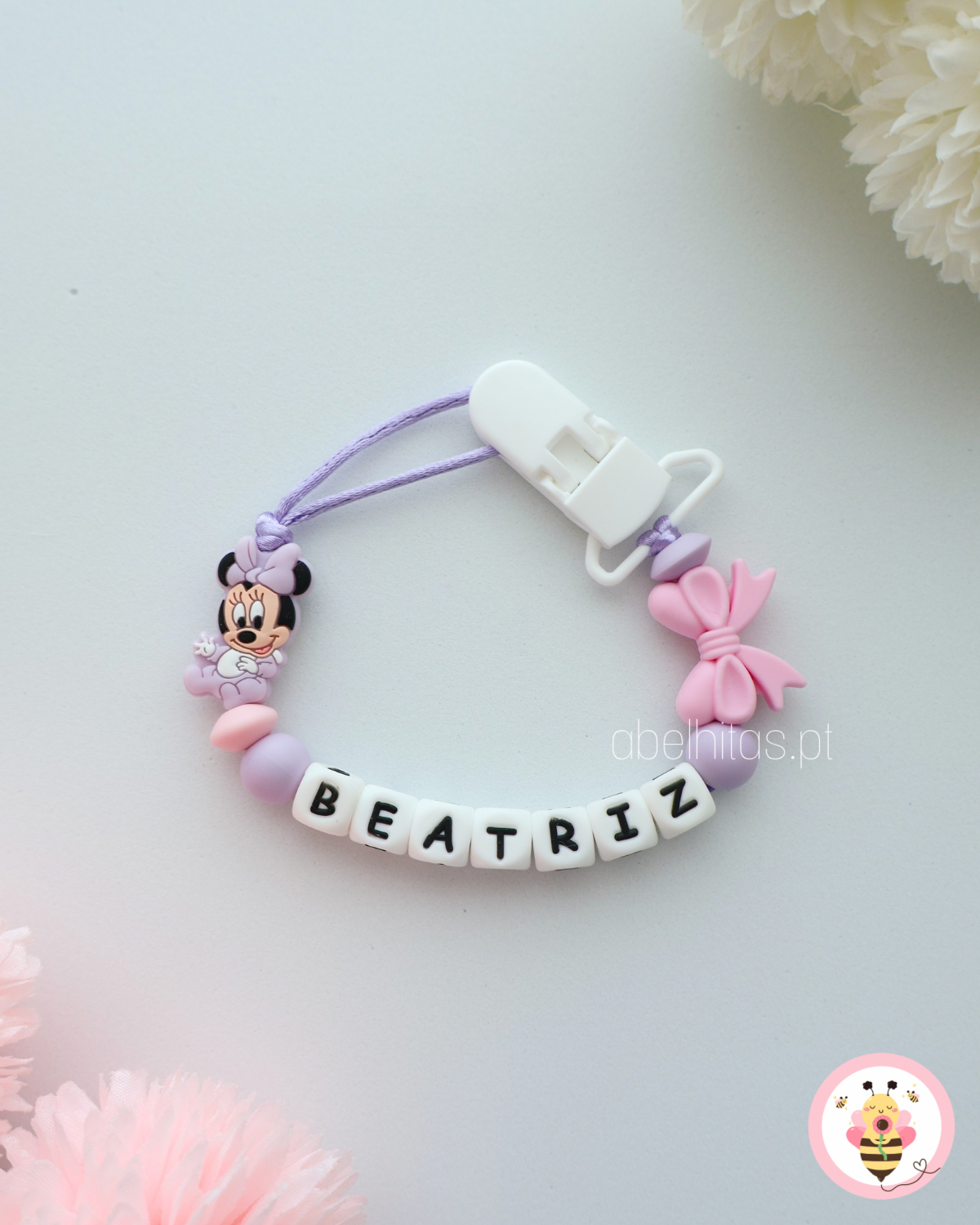 Prendedor de chupeta com nome - Minnie lilás
