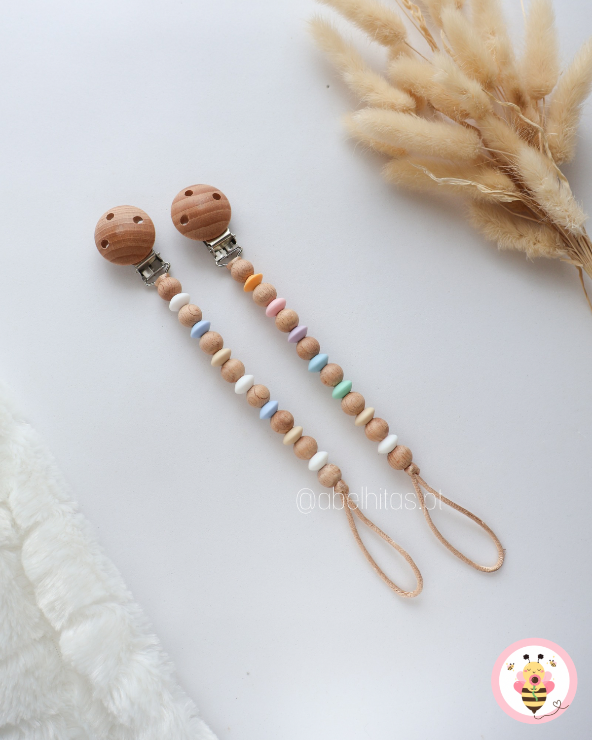 Prendedor de chupeta feito de silicone de grau alimentar e madeira natural tratada.