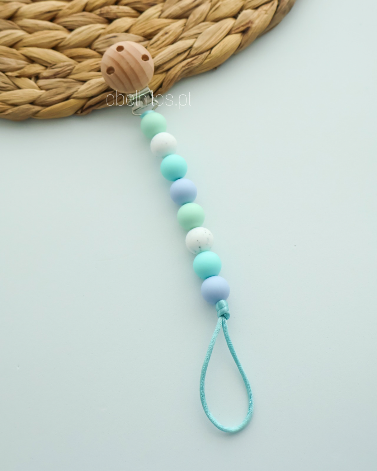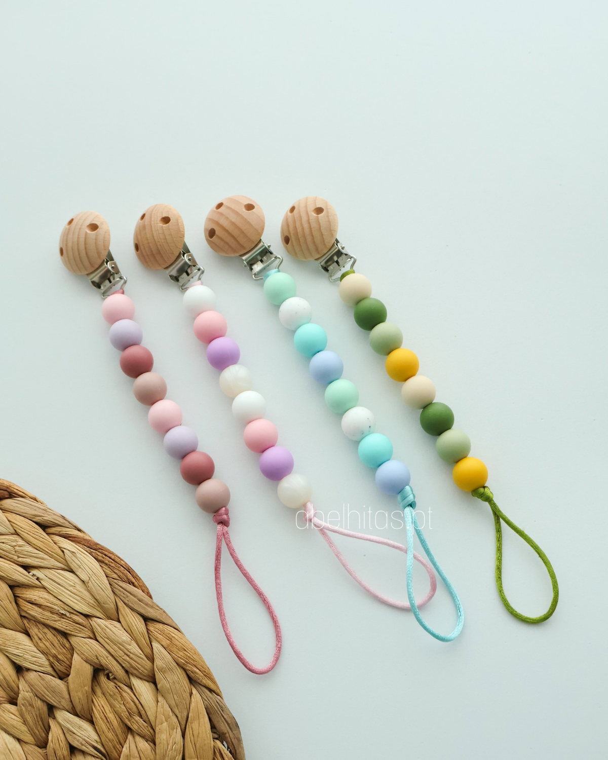 Prendedor de chupeta feito de silicone de grau alimentar. Mola de madeira natural tratada.