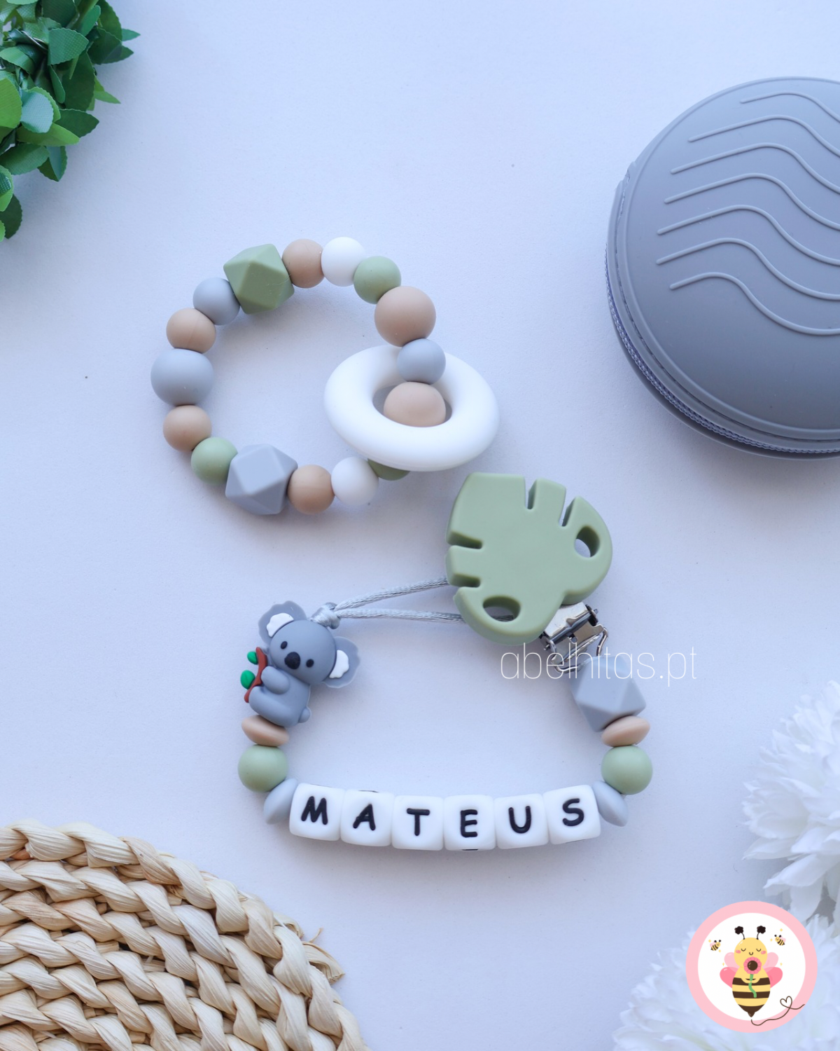 1 prendedor de chupeta + 1 mordedor + 1 bolsa porta-chupetas
